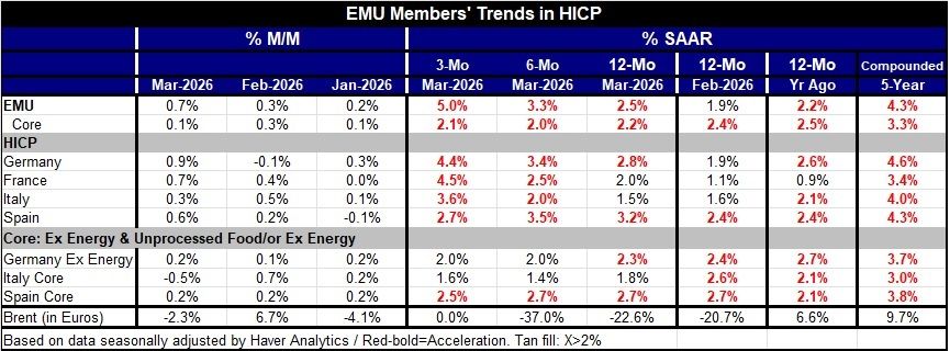 Large economy HICP headlines show pressure The month-to-month increases in the large economies and the monetary union are giving off uncomfortable readings, with Germany posting a 0.9% increase month-to-month, France 0.7%, Italy a more subdued 0.3%, and Spain 0.6%. These numbers help to produce excessive 3-month inflation rates of 4.4% annualized for Germany, 4.5% for France, 3.6% for Italy, and 2.7% for Spain—all of them over the top (that expression, of course, refers to European Central Bank’s inflation objective of 2%).