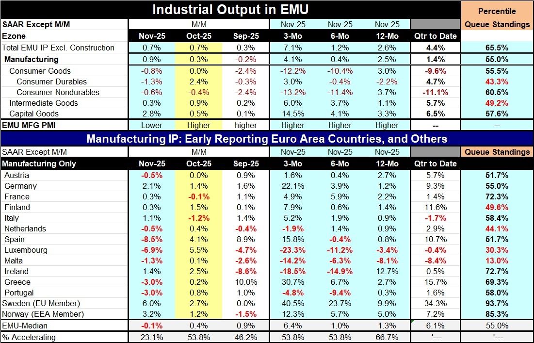 Mixed results monthly To be sure, there are more outsized declines across countries than there are increases. Spain posts an 8.5% output decline on the month. Luxembourg posts a 6.9% decline, with Greece and Portugal each logging declines of 3%; however, in all these cases, these negative growth rates in November are reversing or blunting positive growth rates in October. Countries logging strong growth rates in November are Germany at 2.1%, Italy at 1.1%, and Ireland at 1.4%. Outside of the monetary union, Sweden has a gain of 6% and Norway a month-to-month gain of 3.2%. Germany, Italy, Greece, and Sweden exhibit accelerating growth from 12-months to six-months, to three-months. Luxembourg and Ireland exhibit steadily decelerating growth.