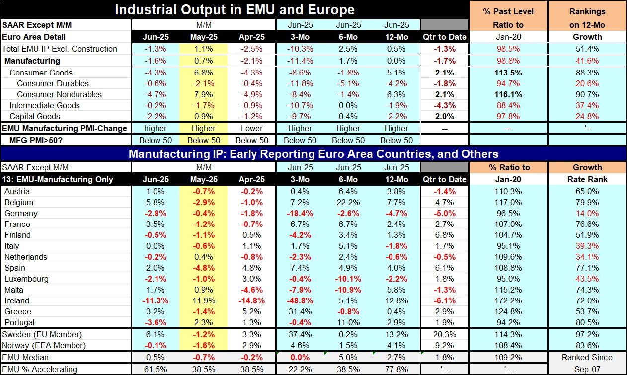 Sequential growth rates Industrial output excluding construction gained 0.5% over 12 months, rose over six months at a 2.5% annual rate, and then experienced a sharp decline over three months as output fell at a 10.3% annual rate. Consumer goods output gained 5.1% over 12 months but declined at a 1.8% annual rate over six months and fell at an 8.6% pace over three months; both consumer durables and nondurable goods output are sharply lower over three months. Intermediate goods output fell by 1.9% over 12 months; it's flat over six months and then dropped at a 10.7% annual rate over three months. Capital goods output fell 2.2% over 12 months, gained 0.4% at an annual rate over six months, then fell sharply at a 9.7% pace over three months. To some extent, this is a tariff-related trend as firms in Europe had cranked-up output to get goods out ahead of the tariffs and now that we are in the actual tariff period output is being cut back to trend and to account for the previous surge. So, the reductions in output appear a little more draconian than the actual weakness in the economy - these are still trends to watch, however.