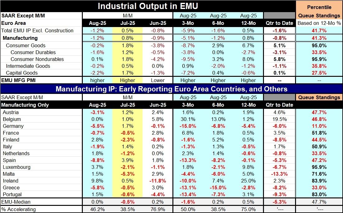 Industrial output in the European Monetary Union fell by 1.2% in August after rising by 0.5% in July. Manufacturing output followed these trends as well, falling by 1.2% in August after rising 0.8% in July. Sequential growth rates from 12-months to six-months to three months show a deteriorating trend with 12-month growth up by 0.5%, six-month growth falling at a 1.6% annual rate, and three-month growth falling at a 5.9% pace. Manufacturing largely follows the same pattern with a 12-month increase of 0.8%, a six-month decline at a 1.2% annual rate, and a 3-month decline at a 5.1% annual rate.