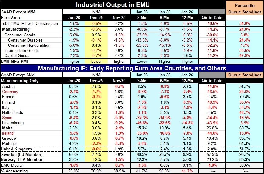 The table also offers up country-by-county data for January. Looking just at monetary union members, seven of twelve show output declines in January, but that compares to December, which was a strong month with only three of those members showing output declines. However, a month earlier, in November, eight monetary union members had shown output declines. There are sequential output declines reported by Germany, Spain, and Ireland over the last twelve-to-six-to-three months. Only Malta and Greece show output trends that are accelerating, and of course, these are two of the smaller monetary union countries. Seven monetary union countries show quarter-to-date output is declining early in this first quarter. Among the five countries showing output increasing, two of them showed double-digit growth rates in the new quarter and those two again are Malta and Greece. For the countries overall, only five of twelve have queue percentile standings of their earlier growth rates that are above their historic medians for the last 20 years. That list of five includes France, Malta, Greece, Portugal, and Austria.