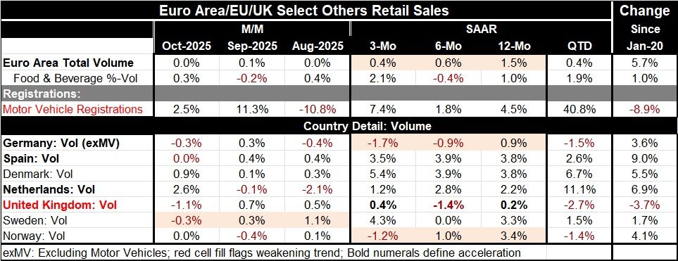 European Monetary Union (EMU) retail sales in October were flat. Food & beverage sales rose by 0.3%. The profile on sales continues to be weak although from 12-months to six-months to three-months sales are still growing. However, the growth rates are decelerating sequentially. Total sales volumes grow by 1.5% over 12 months, advance at a 0.6% annual rate over six months, and gain at an even slower 0.4% annual rate over three months. Food & beverage volume spending rises by 1% over 12 months and at a 2.1% annual rate over three months after declining 0.4% over six months.