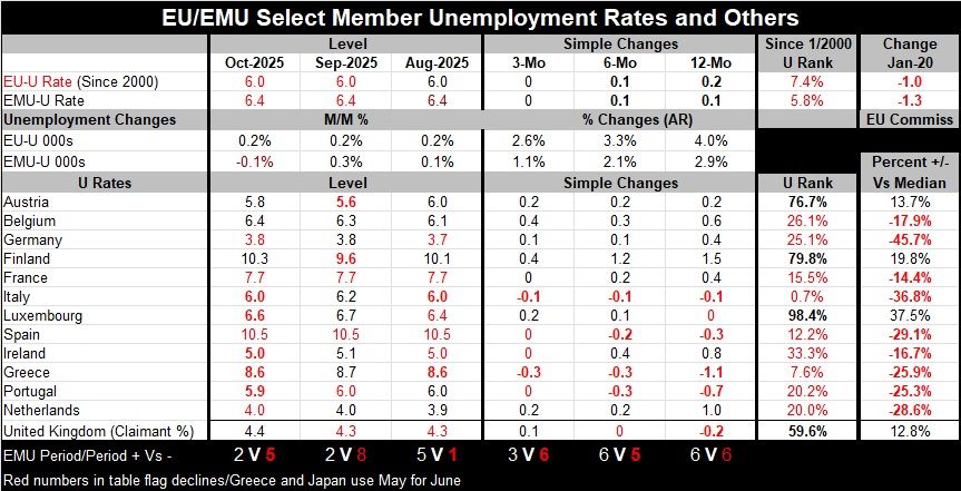A good October Conditions in Europe for unemployment remain extremely favorable although there are signs of pressure and the rate itself is slightly off of its all-time low. October, however, was a pretty good month for unemployment as the table gives us unemployment statistics for 12 monetary union members. Among those 12, only three had unemployment rates rise: Finland (from 9.6% to 10.3%), Belgium (from 6.3% to 6.4%), and Austria (from 5.6% to 5.8%). Outmatching the rising unemployment rates, we're falling unemployment rates in Italy, Luxembourg, Ireland, Greece, and Portugal. The raw number of unemployed in October in the EMU fell (while the raw number of unemployed rose slightly in the EU).