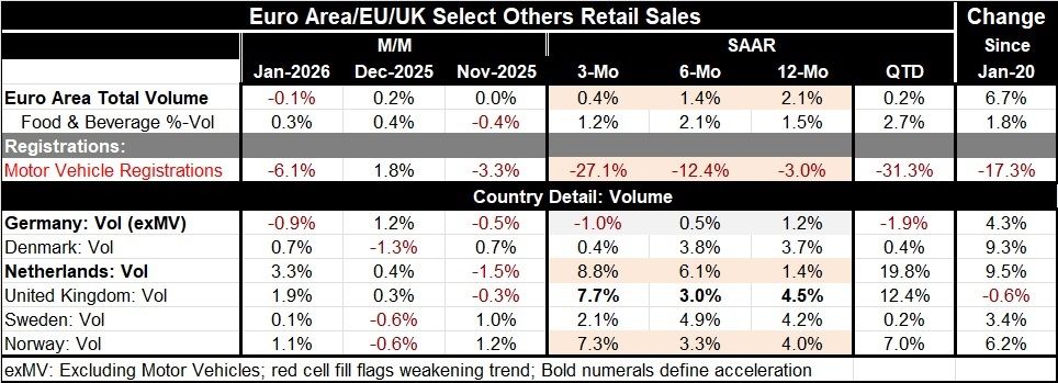 Germany is the largest economy in Europe, and its sales fell in January. More disconcerting, sales in Germany are generally on a decelerating path, growing at a 1.2% pace over 12 months, at a 0.5% pace over six months, and contracting at a 1% annual rate pace over three months. The Netherlands, another monetary union member, is experiencing a very different trend, with sales rising by 3.3% in January and then accelerating from 12 months to six months to three months as growth rates have progressed from 1.4% to 6.1% to 8.8%, respectively. In Denmark, a European Union member but not a monetary union member, sales rose by 0.7% in January, while its sequential sales show growth rates of 3.7% over 12 months and 3.8% over six months, and then suddenly weaken to 0.4% over three months.