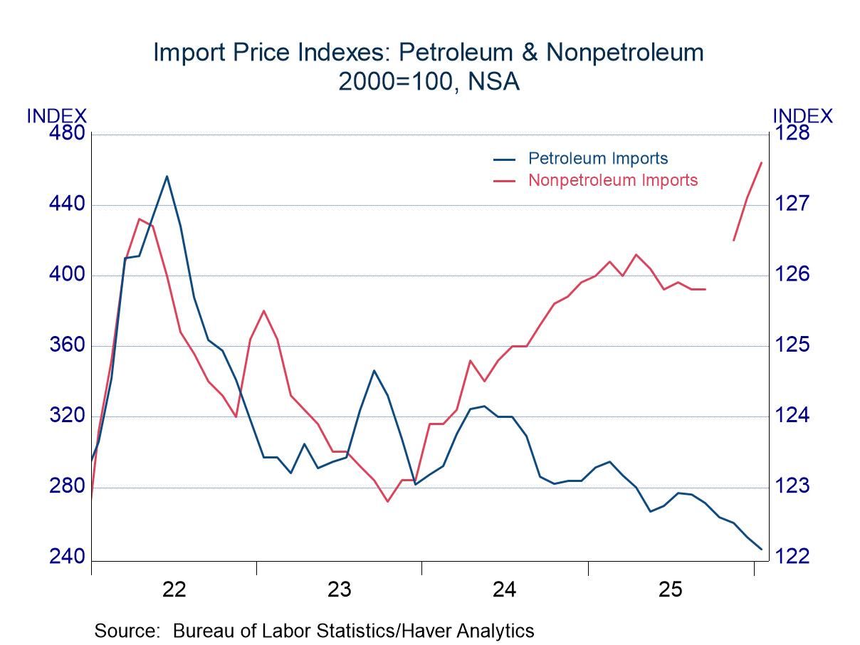 The distinctly different paths are evident in the chart above (right), which plots the levels of these price indexes rather than the percent changes. (Figures for nonpetroleum prices are not available for October because of the government shutdown.) The break in trend for nonpetroleum import prices is striking. One is tempted to argue that the surge reflects the effects of tariffs, but this is most likely not the case. The figures in this report are based on invoices before the imposition of tariffs, and thus there is no direct effect.