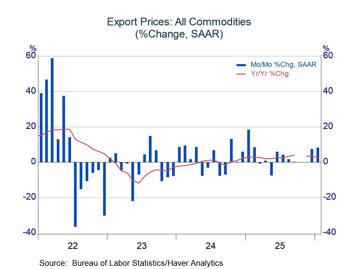 These import and export price series are not seasonally adjusted; they can be found in Haver’s USECON database. Detailed figures are available in the USINT database. The expectations figure from the Action Economics Forecast Survey is in the AS1REPNA database.