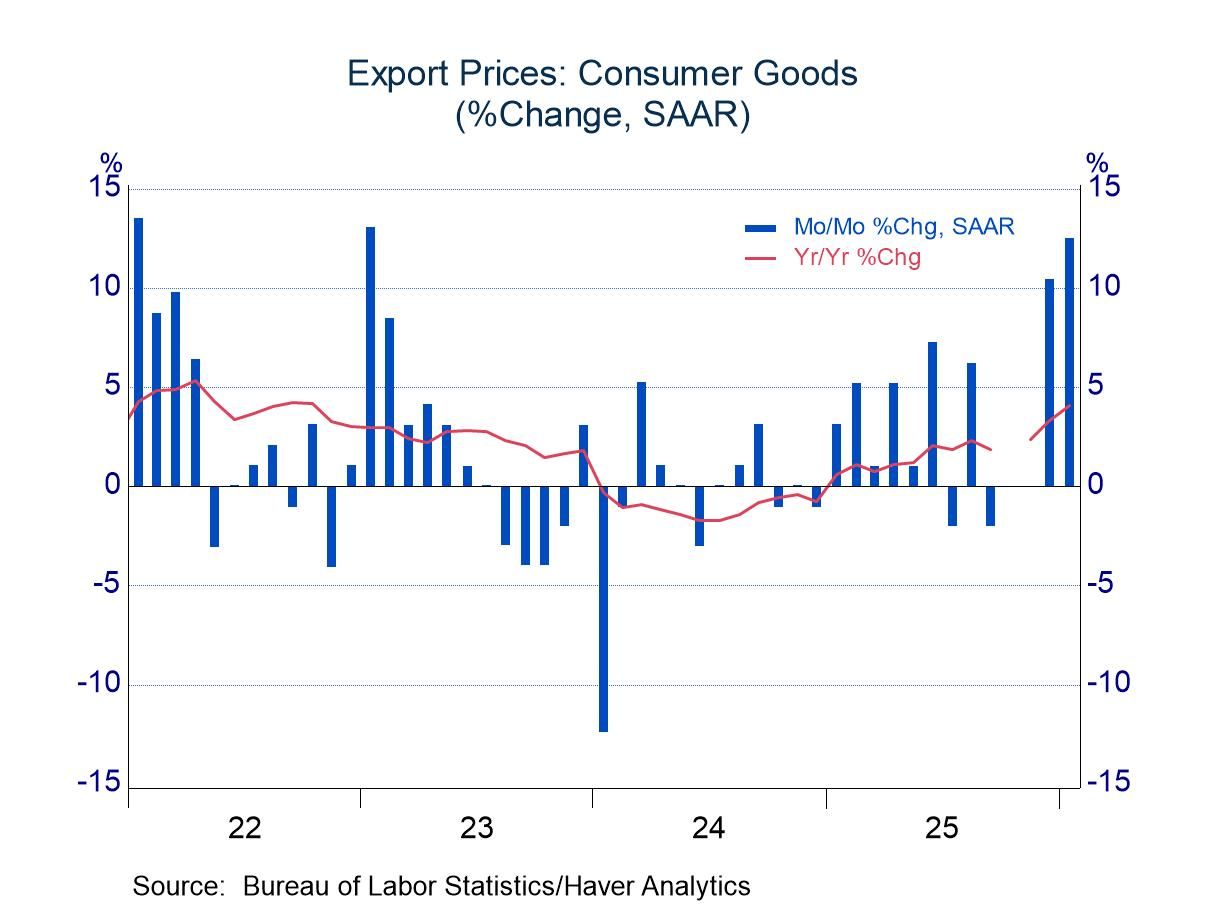 On the export side, prices rose 0.59% in December and 0.65% in January (annual rates of 7.3% and 8.0%). The jumps represent a marked deviation from the modest net change seen from March through September last year (October is not available because of the government shutdown). Several components of the headline index remained contained (automobiles, food, industrial supplies), but prices of consumer goods and capital goods surged. The cause of the acceleration is not perfectly clear. Perhaps the soft tone of the foreign exchange value of the dollar in the past year or so offered the opportunity to boost profit margins by raising dollar prices.