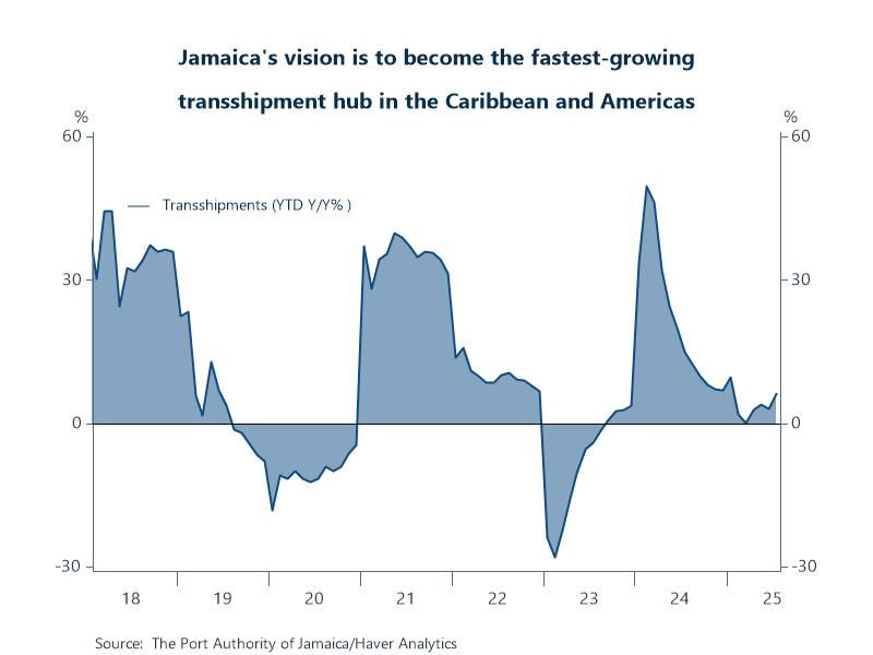 Chart: Port of Kingston transshipment cargo handling is on a strong positive trajectory. YTD y/y growth was 6.21% in July following almost two years of consecutive positive growth. This is being driven by major investments, new modern equipment like Super Post-Panamax cranes, expansion projects and achievement of international security standards - all positioning Jamaica as a key Caribbean logistics hub.