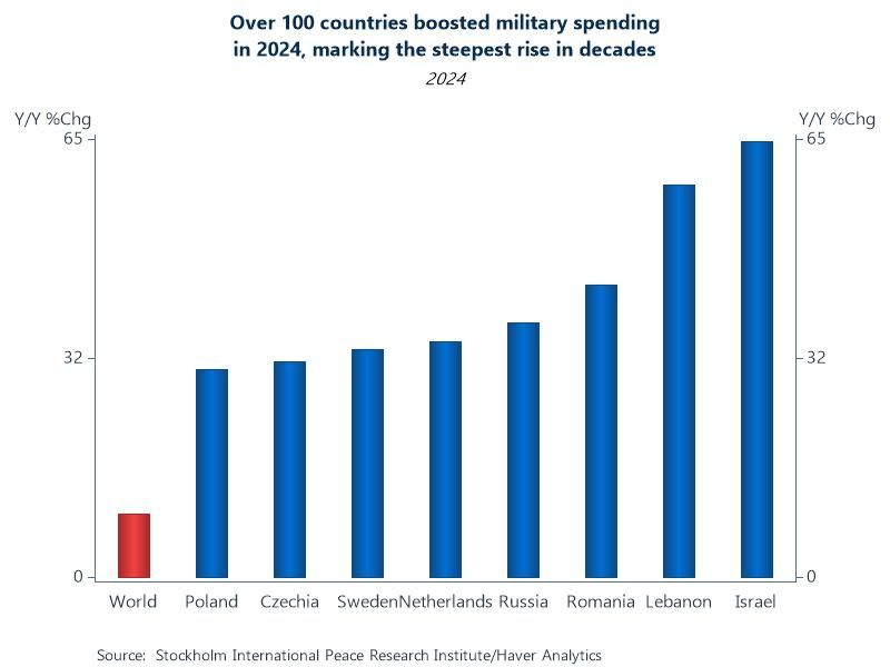 Chart: Global military expenditure hit $2.7 trillion in 2024, a 9.4% y/y increase, the largest since the end of the Cold War. This puts military spending at a record high, driven by conflicts in Ukraine and the Middle East. Over 100 countries boosted spending in 2024 impacting budgets as a share of GDP and government spending. In essence, the world is witnessing an unprecedented widespread militarization driven by conflict and strategic competition, shifting resources from peacebuilding to national defense.