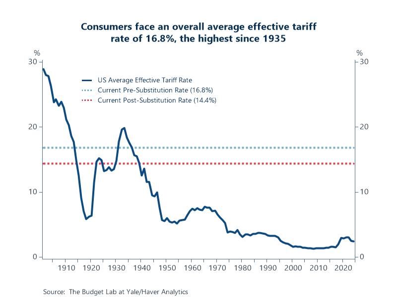Chart: Assuming there are no shifts in the import shares of different countries and products—current tariff policy would increase the average effective tariff rate to 16.8%, the highest since 1935. A pre-substitution approach is a good measure of welfare, since it reflects the full cost faced by consumers before they start making difficult spending choices. After imports shift in response to the tariffs, the overall US effective tariff rate is estimated to decrease to 14.4%, the highest since 1939. The timing of the transition from pre to post substitution is uncertain. Some shifts are likely to happen quickly, while others may take longer.