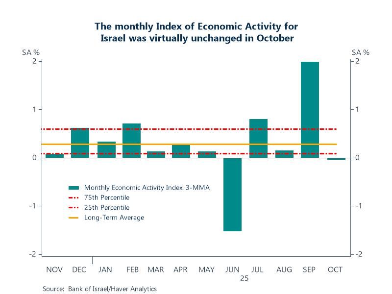 Chart: The monthly Index of Economic Activity was virtually unchanged in October, following an increase in September that reflected the emergence from Israel’s military operation against Iran. The Index was negatively influenced by much of the underlying data including declines in credit card purchases and goods exports in the mixed-high technology industries – however indirect tax and income tax data, and actual GDP for the third quarter moderated the decline in the Index.