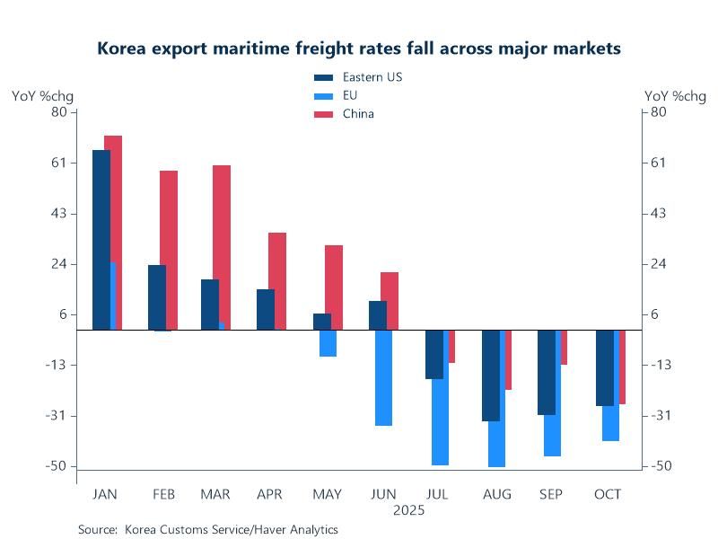 Chart: October 2025 saw ocean container export shipping rates in Korea fall across the board. YoY, rates to the EU fell by 41% marking 6 consecutive months of decreases. Rates to the east coast of the US and to China fell by 28% and 27%, respectively – marking 4 consecutive YoY monthly declines. These rate reductions are being fueled by a decrease in export volume bound for these regions. The rush by countries to front-load export shipments before the Trump administration imposes reciprocal tariffs has been easing.
