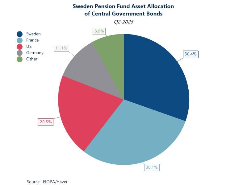 Chart: In July, EIOPA signaled a shift towards heightened liquidity resilience across the European occupational pensions landscape. Risk managers are now subject to enhanced regulatory scrutiny relating to stress testing, liquidity buffers and governance. This data set offers detailed country-level glimpses into asset exposure - e.g. Q2 2025 pension fund exposure to government bonds for Sweden sat at 30% for Swedish and French bonds, US bonds at 21% and German bonds at 11%.