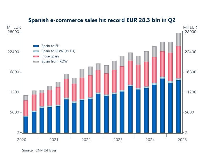 Chart: Spain’s e-commerce market posted double-digit QoQ growth in Q2 2025, reaching record sales of 28.3 billion euro, up 22.6% YoY. The number of transactions also climbed, by 16.8% YoY, to more than 493 million. 31.6% of the spending was domestic, between Spanish sellers and buyers, while the revenues of transactions originating in Spain that were sent to foreign locations accounted for 54.2% of the total, the vast majority to the EU.