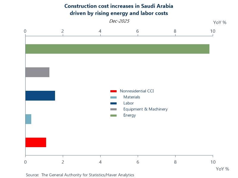 Chart: Construction costs in Saudi Arabia have been steadily on the rise since July 2024 as the kingdom presses ahead with large-scale development projects tied to its economic diversification agenda. In the latest December reading, the total, residential and nonresidential indexes all increased by 1.1% YoY. In the nonresidential sector, the increase is attributed to a 1.5% rise in labor costs, a 1.3% increase in equipment and machinery rental prices, and a 9.9% increase in energy prices.