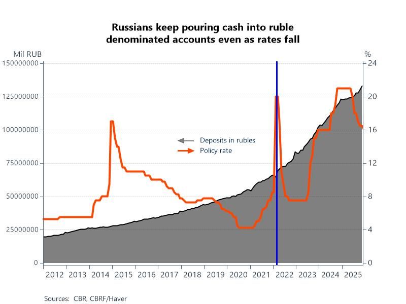 Chart: Russians have amassed a record amount of bank deposits as they take advantage of historically high interest rates in the wartime economy. Upon the invasion of Ukraine in 2022, panicked depositors rushed to withdraw cash. The central bank moved quickly to hike its key interest rate to 20% in an emergency step to stem the outflow. Rates were hiked again starting in 2023 to curb accelerating inflation. The extended period of high interest rates has made ruble deposits one of the most profitable investments in the country and has led to a doubling of deposits since 2022.
