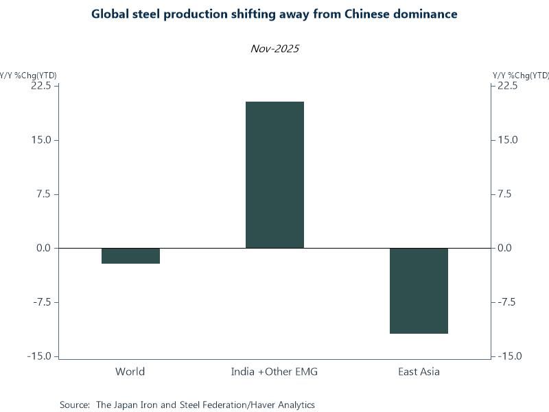 Chart: Although China still produces roughly half of the world’s steel, global steel production is currently defined by a structural shift away from Chinese dominance towards emerging economies - specifically India. While 2024 & 2025 data show a general contraction in overall global output (-2.06% YoY), significant regional variations persist, with high growth in India and other emerging economies like Iran and Vietnam and sharp declines in East Asia, which includes China, Japan and South Korea.