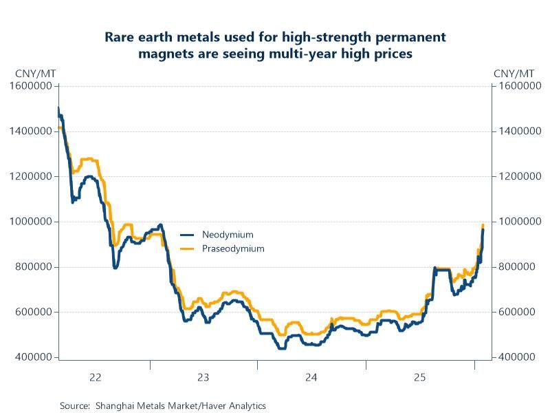Chart: Neodymium and praseodymium prices are experiencing a significant rapid upswing in early 2026, with current prices at levels not seen since early 2023. These metals are primarily used to manufacture permanent magnets essential for EV motors, wind turbines, and industrial automation. In January 2026, neodymium increased 12.3% MoM and 62% YoY to 820k CNY per MT. In the same month, praseodymium increased 10.0% MoM and 53% YoY to 853k CNY per MT. The surge is driven by increased rare earth concentrate transaction prices from major Chinese suppliers, reduced export availability, and heightened geopolitical volatility.