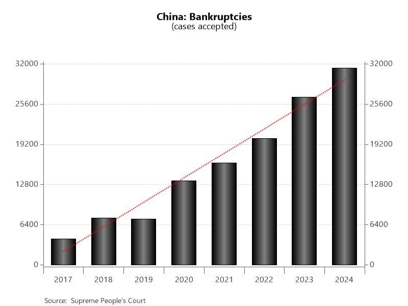 Chart: Bankruptcies are increasing in China, where a protracted economic slowdown, a property slump, and elevated corporate debt levels have triggered high-profile collapses, including developer China Evergrande Group and shadow bank Zhongzhi. Chinese courts handled 31,288 bankruptcy cases in 2024, up from 7,306 in 2019, which is a 328% increase over five years.