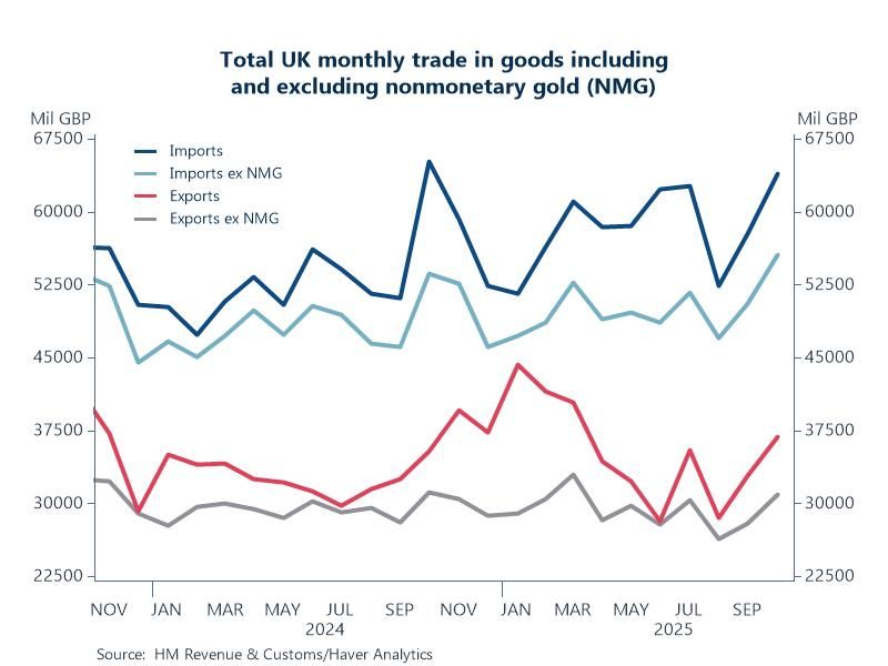 Chart: Movements in NMG, an important component of precious metals, can be large and highly volatile, distorting underlying trends in goods exports and imports. Excluding NMG often shows a higher proportion of trade occurring with the EU compared to when NMG is included, highlighting its importance. For example, in July 2025 Exports to the EU accounted for 44% of the total value of exports, or 50% when excluding NMG. Imports from the EU accounted for 46% of the total value of imports, or 55% when excluding NMG.