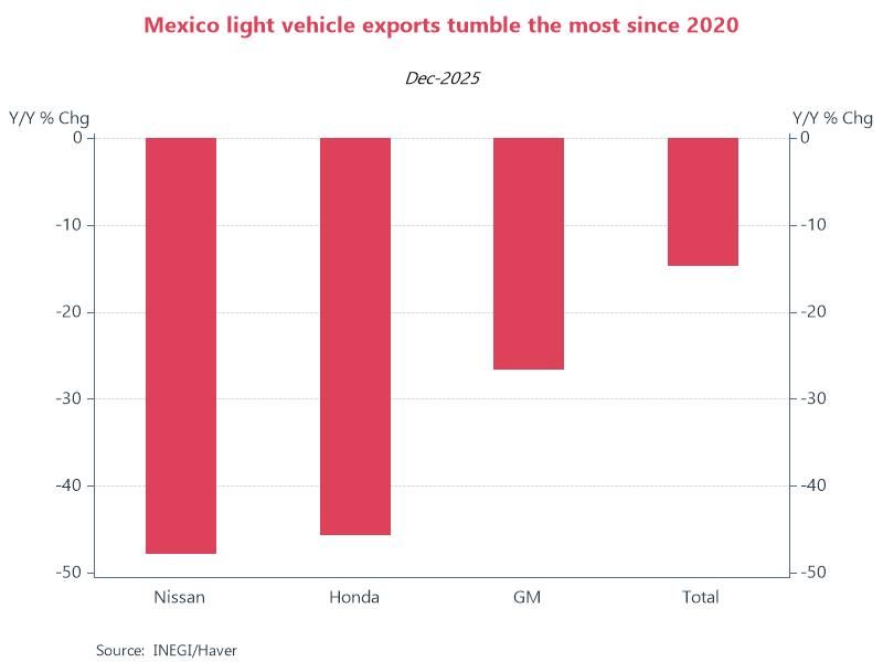 Chart: Light vehicle exports from Mexico plunged by 14.6% YoY to 227,262 units in December 2025, marking the 8th monthly YoY decline of 2025 and making it the sharpest annual drop since 2020. The decrease reflected the impact of tariffs by the US government on Mexican autos and parts, which is a key manufacturing hub for global brands that sell to the US. YoY exports plunged in December for Nissan (-47.7%), Honda (-45.5%) and General Motors (-26.5%).