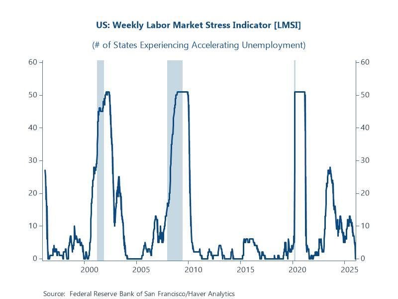 Chart: According to the LMSI, the number of states experiencing accelerating unemployment has been decreasing since mid-July and is currently stands at 0 in the latest week – indicating a stable labor market. Of course, history teaches us that labor market conditions can change quickly. These data serve as a tool to help monitor those changes as they evolve. Also note how these series closely track NBER recessions.