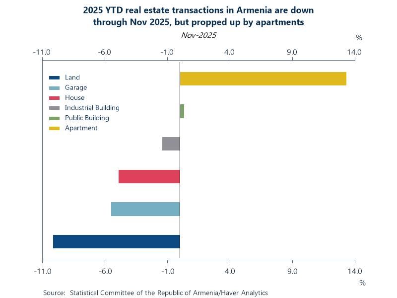 Chart: After a strong 2024 that ended with a 12.9% YoY increase in number of real estate transactions in Armenia, 2025 started in negative territory of around 7.0%. Despite YTD real estate transactions being down for almost all categories through November 2025, the total is down only 2.5% due to a strong performance by real estate transactions for apartments, which are up 13.3% through November.