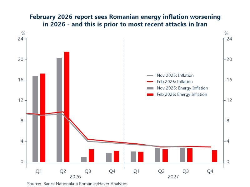 Chart: Since the November 2025 report, overall inflation forecasts for 2026 in Romania worsened from a quarterly average of 6.5% to 6.8% in the February 2026 report. Energy inflation increased almost a full percentage point for 2026 from a quarterly average of 9.9% to 10.8%. Note that the February report was released a full 10 days prior to the February 28 attacks on Iran, so it will be interesting to see how these forecasts change when the National Bank of Romania updates them in May.