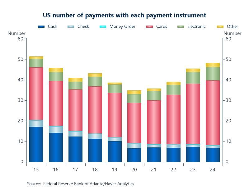 Chart: In 2024, there were statistically significant increases in the number of all payments compared to 2023 – they increased by almost three payments, or 5.4%, to 48 on average per consumer per month. Consumers continued their move away from paper payment methods as lower shares were reported using cash and checks. The number of cash payments decreased by 8.2% YoY. Payment cards retained their dominance in the consumer sphere, representing 2/3 of payments by number.