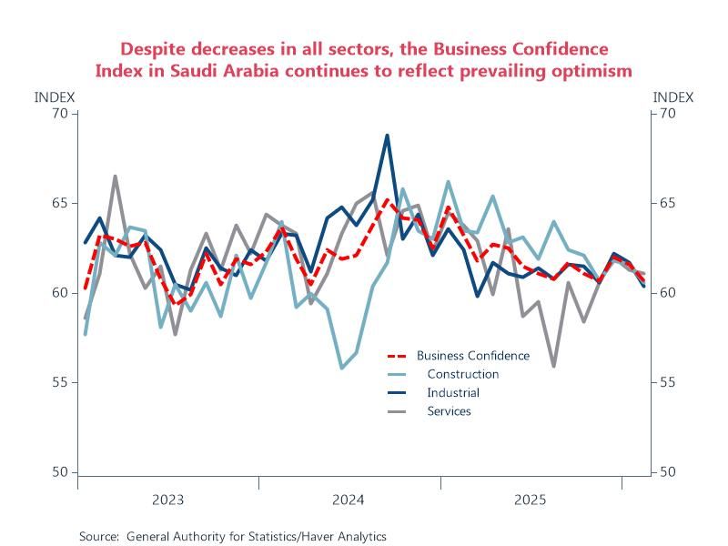 Saudi Arabia's Business Confidence Index was added to EMERGEMA. An overall index plus detail for the construction, industrial and services sectors are available. Data are reported on a scale from 0-100, with 50 representing the neutral level. Values above 50 indicate optimism, while values below 50 reflect pessimism. Monthly data are sourced from the General Authority for Statistics and start in January 2023.