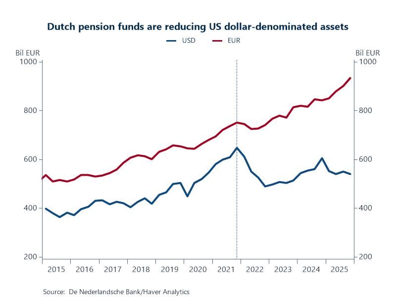 Chart: Dutch pension funds have been reducing their overall exposure to dollar assets. At the end of 2025, they held €541bn in dollar-denominated investments, down from €648bn at the end of 2021. Over the same period, euro-denominated investments increased from €752bn to €935bn. Drivers for this include heightened USD volatility, growing concerns over the US debt load, as well as policy and tariff uncertainty under the Trump Administration.