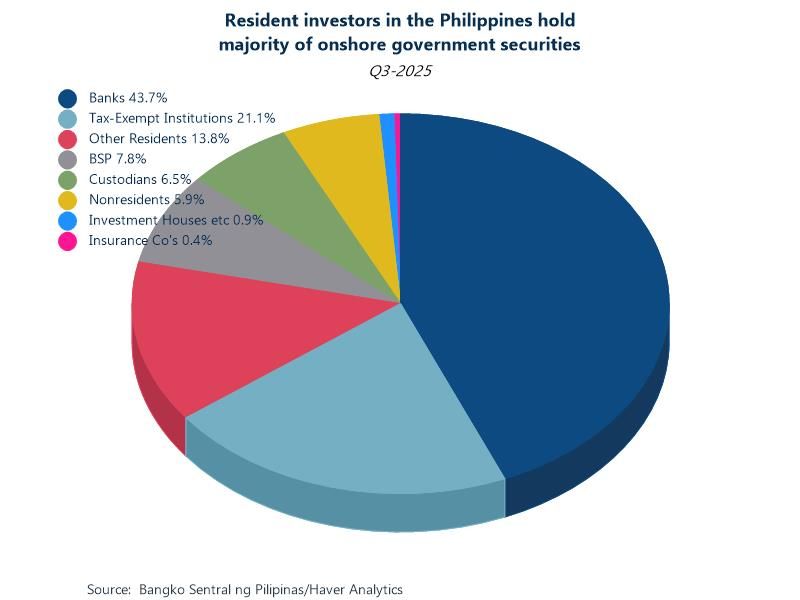 Chart: As of the end of September 2025, foreign holdings of onshore peso government securities rose to 5.9% from 5.1% at the end of Q2 2025. These percentages are significantly higher than only two years ago when the share was 1.7%. Meanwhile, resident investors held the remaining 94.1% of onshore government securities, with banks holding the largest share at 43.7%, followed by tax-exempt institutions (21.1%), other residents (13.8%), and the Central Bank of the Philippines (7.8%).