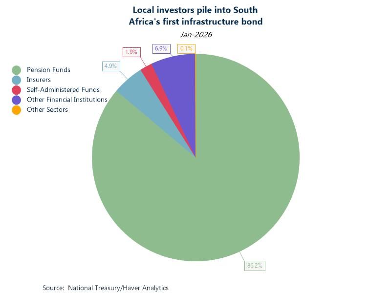 Chart: South Africa raised 11.8 billion rand in its first infrastructure-bond sale, drawing bids for more than twice the amount sought and boosting its construction-led growth plans. The main participants were local investors, particularly the pension funds which hold 86.2% of the debt. There was very limited direct interest from offshore accounts (<0.1%). Africa’s largest economy sold 7 billion rand of 10-yr debt and 4.8 billion rand of 15-yr notes. Bids for the securities exceeded 26 billion rand, reflecting strong market confidence.