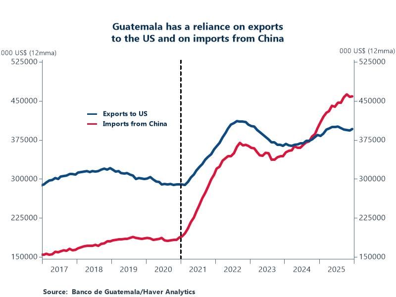 Chart: The US remains Guatemala's top trading partner - receiving over 30% of its exports and driving its textile & apparel industry via CAFTA-DR. Since 2021, exports to the US have increased by 36.6% further cementing the deep economic partnership between the nations. China has emerged as its second-largest trading partner, driven almost entirely by imports, which have increased by 144.6% since 2021. However, exports to China are negligible, thus creating a lopsided, import-dependent relationship.