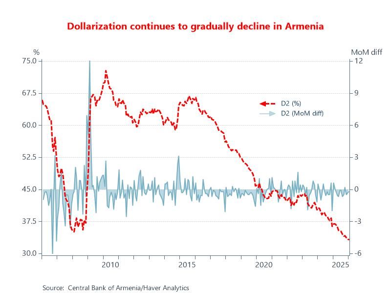 Chart: In January 2026, the dollarization rate in Armenia, in this case measured as the ratio of resident dollar deposits to total resident deposits, dropped to 33.2% - its lowest level since the beginning of the time series. It has been demonstrating a steady downward trend since January 2016, when it stood at 66.5%. An appreciating Armenian dram against the USD, proactive de-dollarization policies by the central bank, and significant Russian capital inflows have been the drivers of this trend.