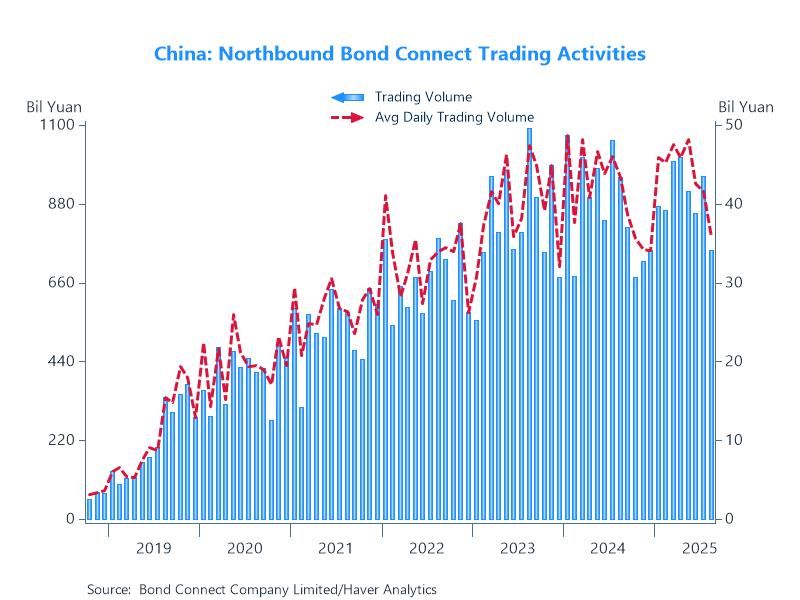Chart: Since China introduced Northbound bond trading in 2017, its financial market has seen substantial growth in foreign investment, increasing investor access and deepening financial integration. In 2024, trading volumes totaled 10.4 trillion yuan, and the average daily trading volume has remained consistently high in 2025, averaging 46 billion yuan in the first half of 2025. The latest trading volume figure was 750.1 billion yuan, and the monthly average daily turnover stood at 35.7 billion.