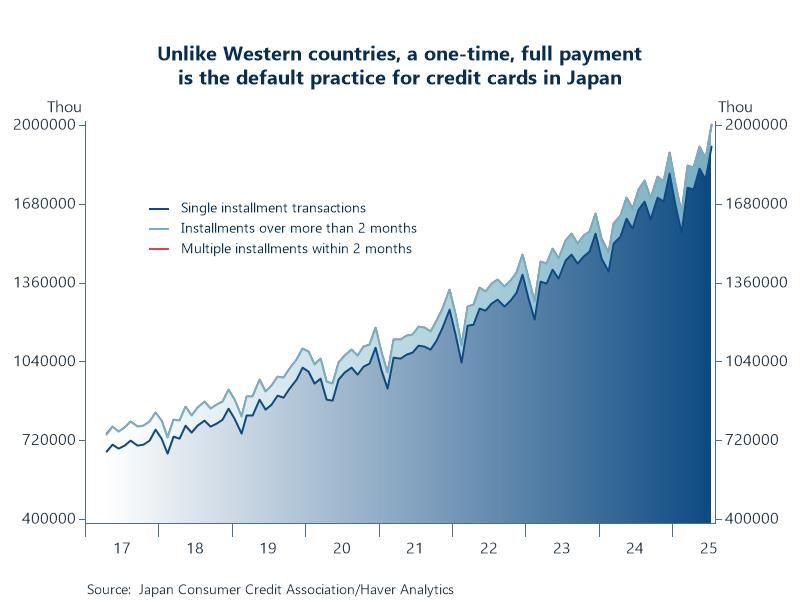Chart: Japan has been steadily transitioning away from cash toward credit cards and other cashless payments. Total credit card transactions have increased by 90% over the last 5 years and 160% since 2017. In July 2025, 95.5% of credit card transactions were one-time full payments, which is the default practice in Japan and reflects Japanese consumers’ general aversion to credit card debt and high interest fees associated with revolving payments.