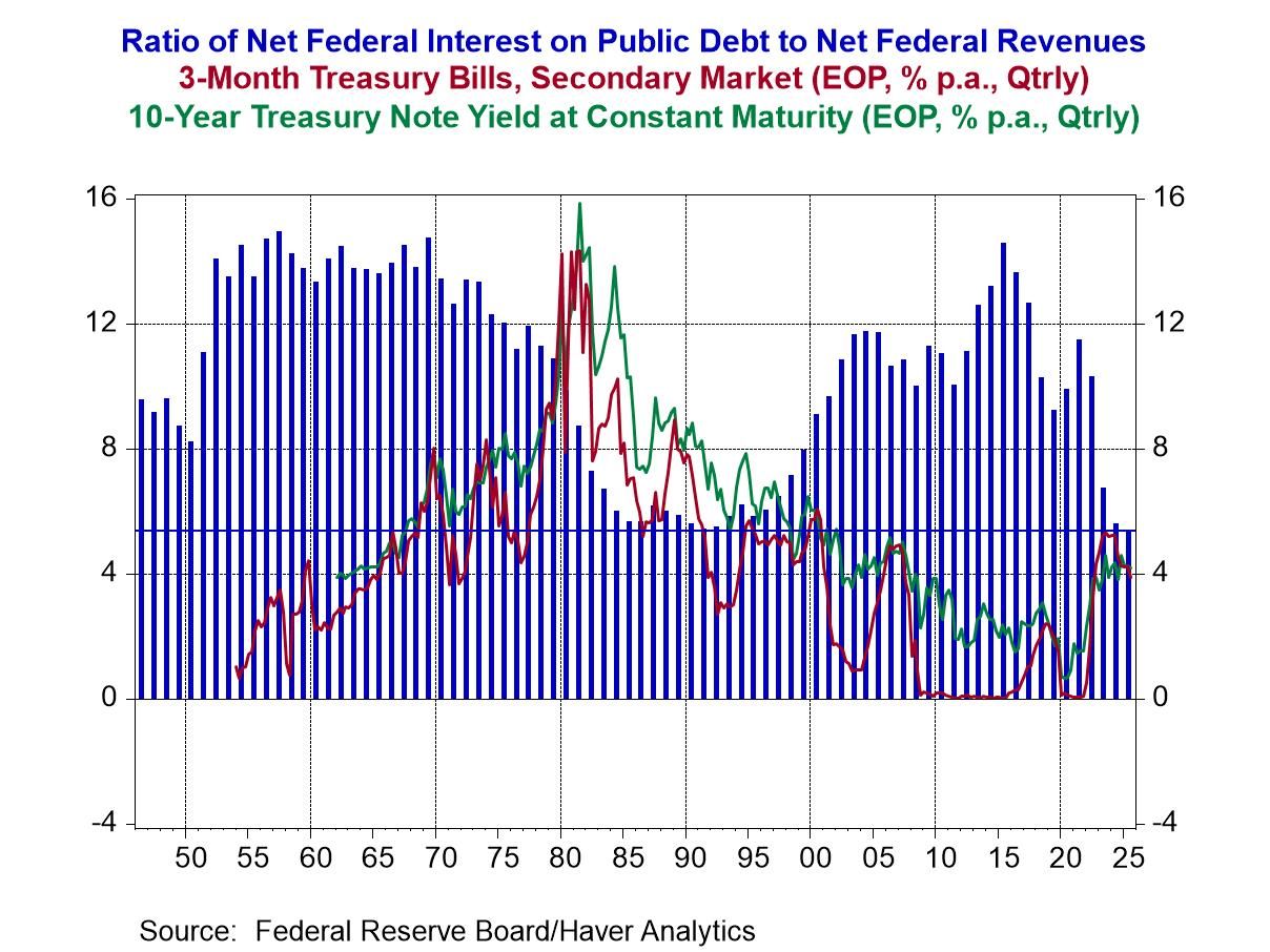 Plotted in the chart below are fiscal year (FY) ratios of federal net interest payments on the public debt to federal net revenues (blue bars) along with end-of-quarter 3-month Treasury bill rates and 10-year Treasury yields. In FY 2025, the ratio of net interest on the public debt to federal net revenues was 5.4, the lowest in the post-WWII era and the lowest since FY 1991, when interest rates were almost twice the level they are now. You can think of the ratio of net interest to net revenues as similar to a corporation’s interest coverage. The CBO forecasts that with the passage of OBBBA, net interest will increase by $4.7 trillion starting in FY 2026 through FY 2029. Unless there is a Festivus miracle resulting in a commensurate increase in federal net revenues, the federal government’s interest coverage will fall below that of an already low FY 2025’s.