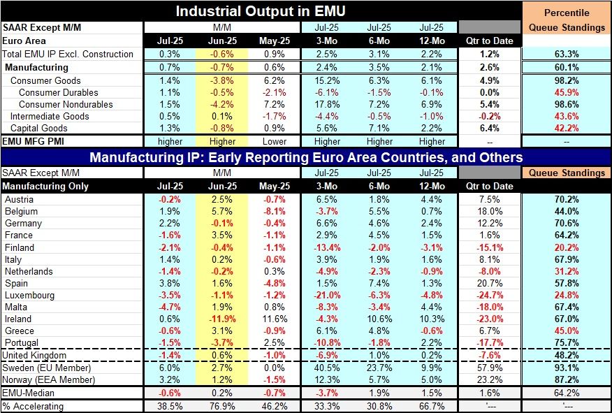 The finalized version for EMU industrial production in the European Monetary Union in July showed that much better than preliminary data had suggested. Overall output rose 0.3% in July, but output in manufacturing on the month rose by 0.7%. Consumer goods output rose by 1.4% on the month with consumer durables output up by 1.1% and nondurables output up by 1.5%. Intermediate goods output rose by 0.5% with capital goods output rising by 1.3%. All of these are very solid numbers.