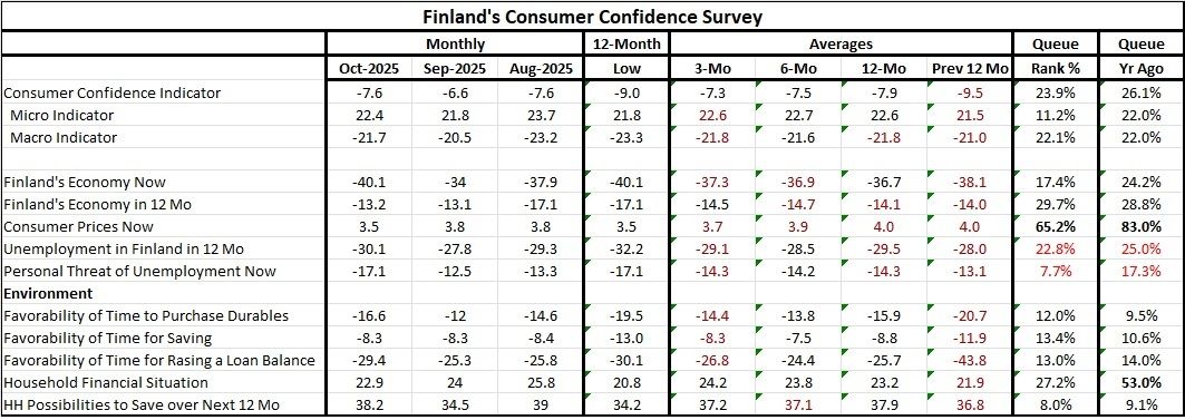 Some details In terms of the rankings, the Finnish consumer confidence survey is dominated by extremely low rankings. Most of them are lower 25th percentile or even lower; however, the index has some redeeming qualities. Among them is the fact that unemployment in Finland, although it deteriorated slightly in October to -30.1 from -27.8 in September, has only a 22.8% standing and it's lower than it was a year ago. People's perception of the personal threat of unemployment fell significantly in October to -17.1 from -12.5. in September; the ranking for that measure is in its 7.7 percentile, a very low ranking and is an improvement from the 17-percentile standing of one-year ago. Despite the weakness in the economy and the difficulties consumers are having in their assessments of confidence, they don't have any kind of fear and certainly not a growing fear of unemployment. That clearly is a silver lining in what we could regard as the dark cloud that dominates this report.