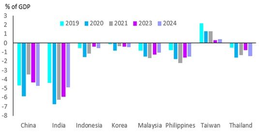 By 2024—apart from China and India—budget deficits across the region were considerably smaller than in the United States or the euro area. Deficits were under 1% of GDP in Indonesia and Korea, and around 1.5% in the Philippines, Thailand and Malaysia, while Taiwan has maintained a fiscal surplus since at least 2019 (Figure 2).