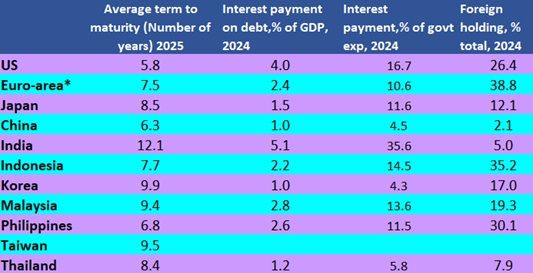First, Asian government debt generally has longer maturities than US Treasuries. India’s average maturity is about 12 years, while China’s is around 6.3 years. Europe and Japan also compare favourably with the United States on this metric.