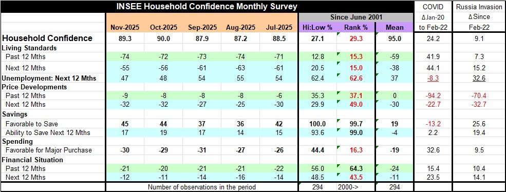 The INSEE household confidence survey for November remains weak and continues to show soft spots. There is little evidence of firming across the components, and the trend behavior is that this index has been slipping at a slow pace over about the last year. None of that seems to be changed as of November 2025.