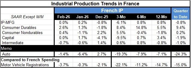 As a separate item, French auto production is slipping and decelerating, falling by 7.1% at an annual rate over 12 months, falling at a 7.9% pace over six months, and then plunging at a 19.3% annual rate over three months. On these same horizons, motor vehicle registrations fall by 14.7% over 12 months; the weakness pares back to an 11.2% annual rate decline over six months, and then it steps up to a 22.1% decline at an annual rate over three months. French demand for autos is not in good shape.