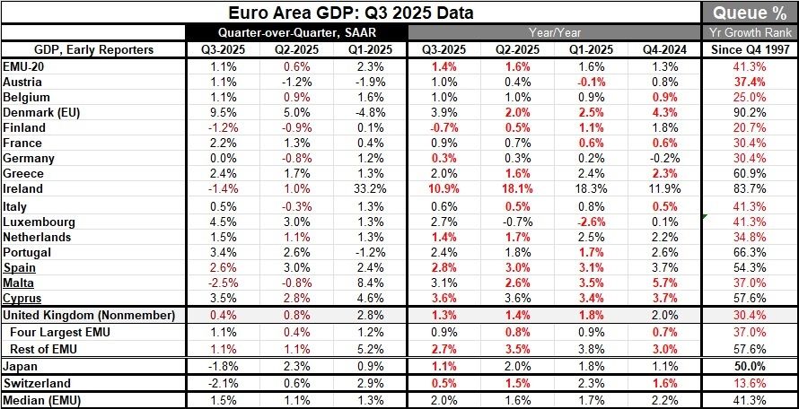 There's not a particular pattern to the median growth rate, which was at 2.2% on the fourth quarter of 2024, slipped to 1.7% in 2025-Q1 and then to 1.6% in in 2025-Q2, and it has picked up to a 2% pace in the third quarter of 2025. The monetary union overall growth rate which is weighted for the size of the underlying economies, shows 1.3% growth in the fourth quarter of 2024, stepping up to 1.6% in the first quarter, remaining at 1.6% in the second quarter, and then slipping slightly to 1.4% in the third quarter of 2025.