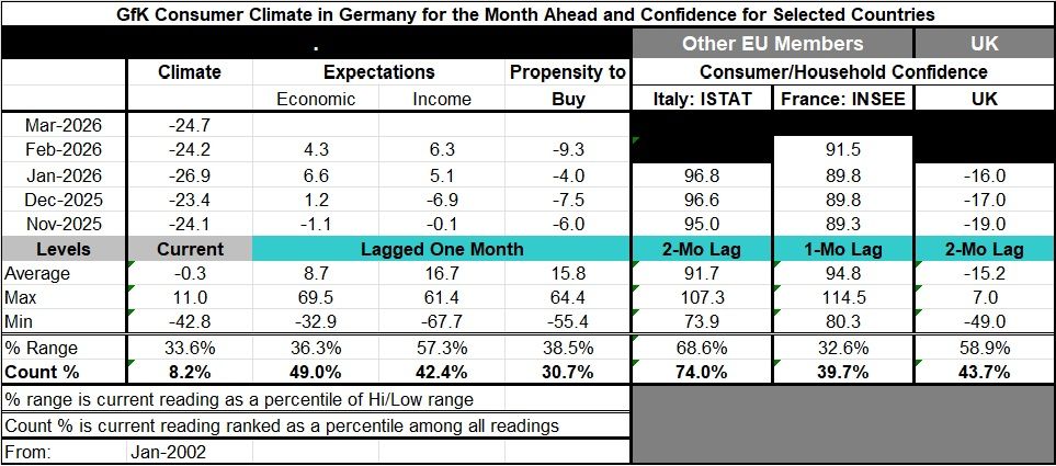 Climate at -24.7 in March has an 8.2 percentile standing on data back to 2002. The economic expectations, reading, fell back to 4.3 in February from 6.6 in January to set a 49-percentile standing. Income expectations rose to 6.3 in February from 5.1 in January. Income expectations have a 42.4 percentile standing. The propensity to buy weakened sharply to -9.3 in February from -4 in January. Its percentile standing is at a 30.7 percentile level, a bottom one-third standing.