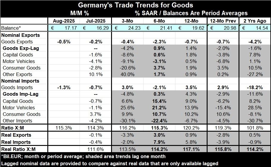 Overall German trade patterns However, German overall trade showing German domestic import strength with real and nominal imports rising solidly and even strongly over 12 months and six months but giving some ground over three months. German nominal and real export trends are showing some growth except over three months but at that, the pace generally is weaker than the pace for imports.