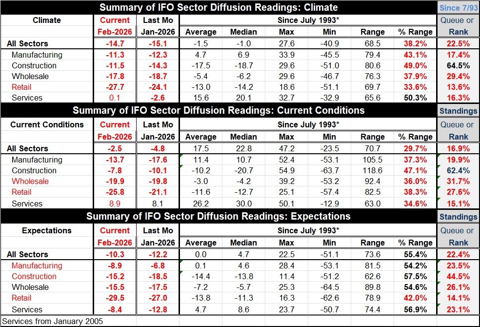 These troubles continue to dog the relationship between the United States and Europe, and the European Community. And Europe’s own economic struggles continue. In the climate readings, all four of five sectors improve from January to February. Current conditions improve in three of the five sectors, with retailing and wholesaling slipping month-to-month. Expectations do improve overall, but three of five sectors take a step back in February, with expectations improving sharply for services, and substantively for wholesaling. Still manufacturing, construction, and retailing expectations stepped back.