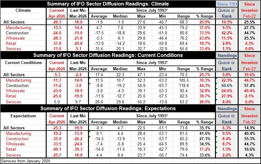 The onset of the war in Iran appears to have hit the German economy extremely hard as the Ifo survey shows very substantial and broad-based decline across its survey in April. The Ifo survey features readings for five sectors as well as an aggregate reading, and it surveys them for climate, current conditions, and expectations. The decline in the Ifo survey is present for all three concepts and across all five sectors, marking the weakening in April as a highly significant and extremely disturbing development. Only manufacturing in the current conditions survey escapes a month-to-month decline.