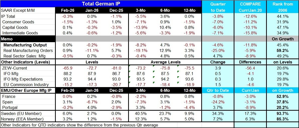 Germany’s industrial production slipped in February, driven lower by dropping output of consumer goods. Sequential growth rates over 12 months, six months, and three months show a confusing array of patterns, except for intermediate goods, where annualized growth rates for output sequentially weaken and show declines on each horizon. All German sector growth rates for the quarter-to-date are showing declines, and the growth rankings by sector are below 50% across the broad, indicating below median performance across German sectors. It’s a very unimpressive report.